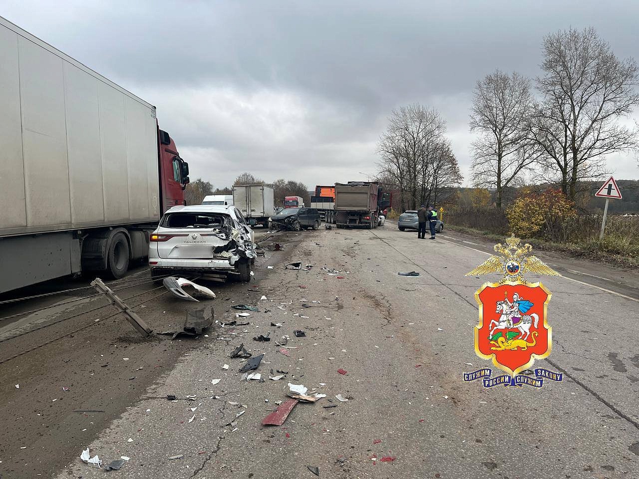 По предварительной информации, сегодня примерно в 12:20 на Домодедовском шоссе в районе поворота на деревню Крюково произошло попутное столкновение с участием двух грузовых и семи легковых автомашин, сообщает