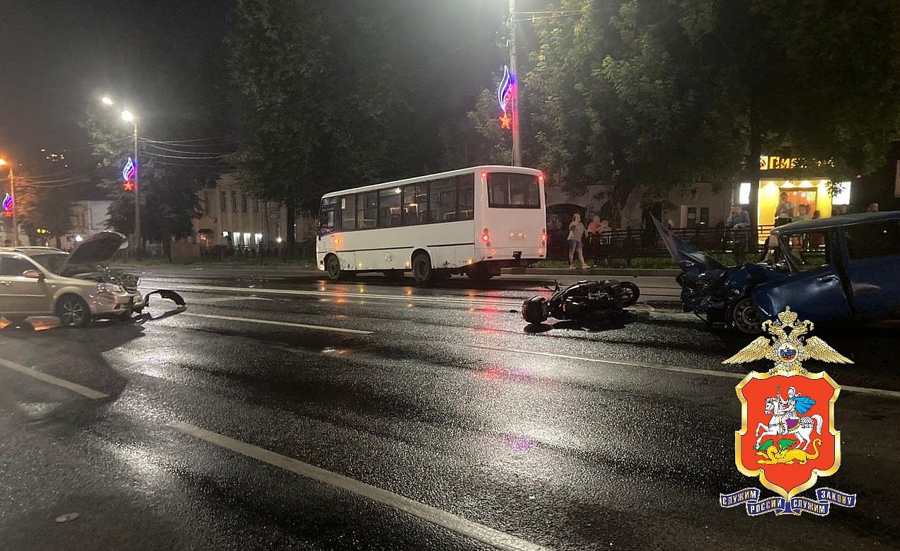 Около 22:20 возле одного из домов на проспекте Ленина столкнулись автобус без пассажиров, три легковые автомашины, мотоцикл и скутер. В результате четыре человека получили телесные повреждения, сообщает