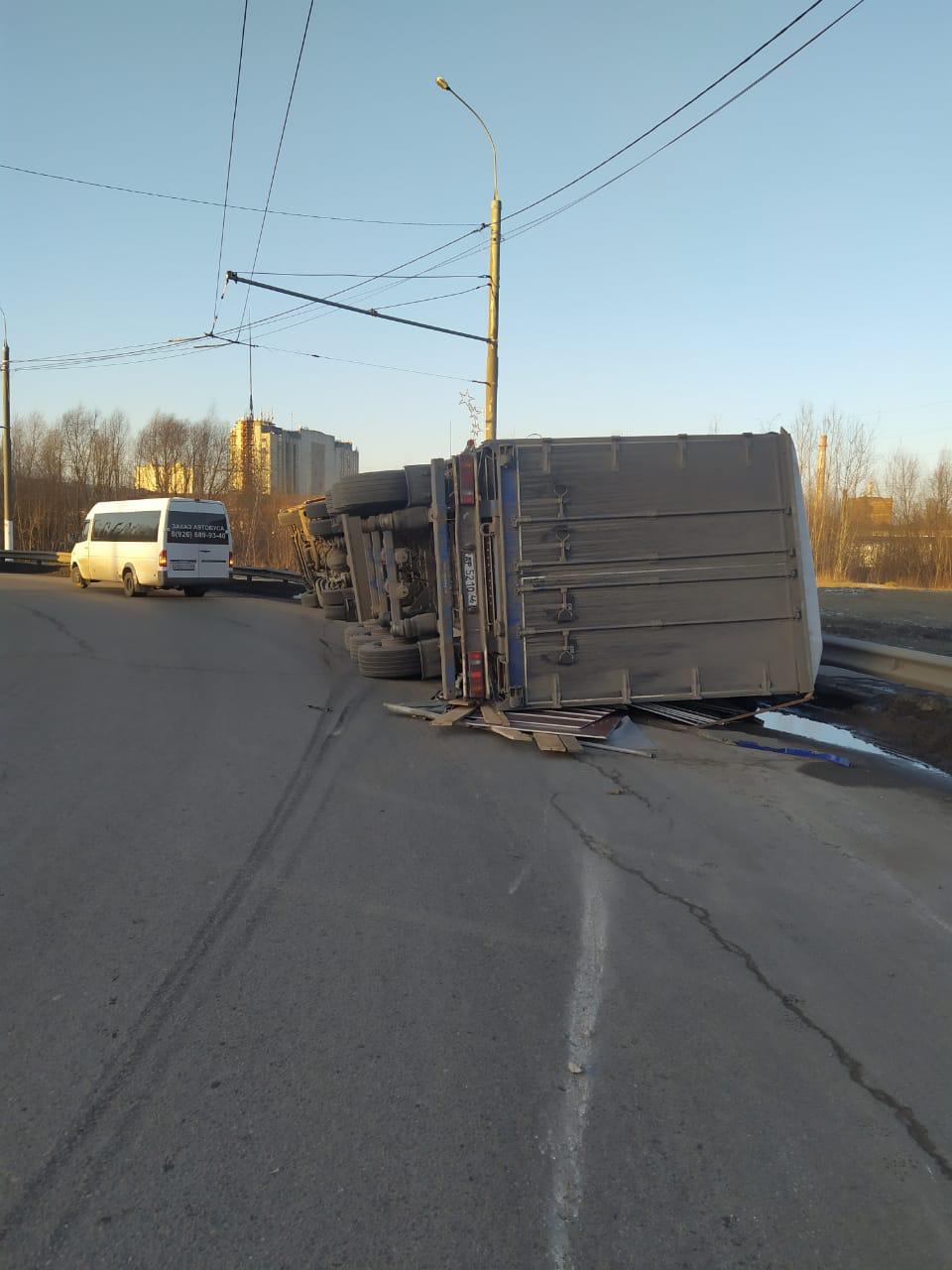 В понедельник около 16.30 на кругу по улице Орджоникидзе произошло ДТП. Водитель грузовика не справился с управлением, машину занесло и она опрокинулась на бок.
