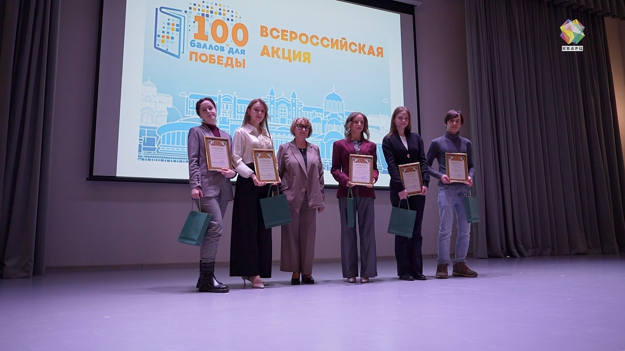 Всероссийская акция «100 баллов для Победы» проходит в нашем округе вот уже в десятый раз. На сцене выпускники прошлых лет – те, кто без проблем расправился с ЕГЭ. Сейчас это студенты самых престижных ВУЗов страны. Михаил Терехов на «сотню» сдал физику, на 98 – математику.