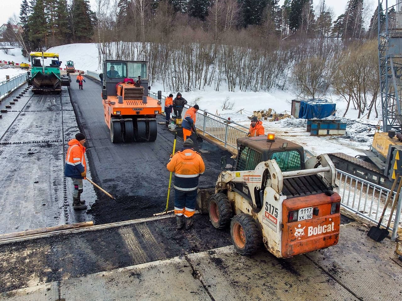 Асфальтобетонное покрытие начали укладывать на временном мосту в Кутьино