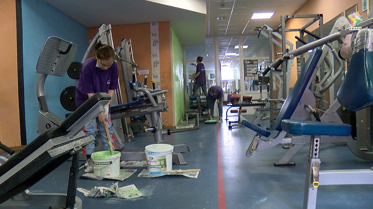 Работают ребята не только на улице. В тренажерном зале молодежного центра «Максимум», школьники обновляют цвет стен, а в танцевальном - проводят влажную уборку.