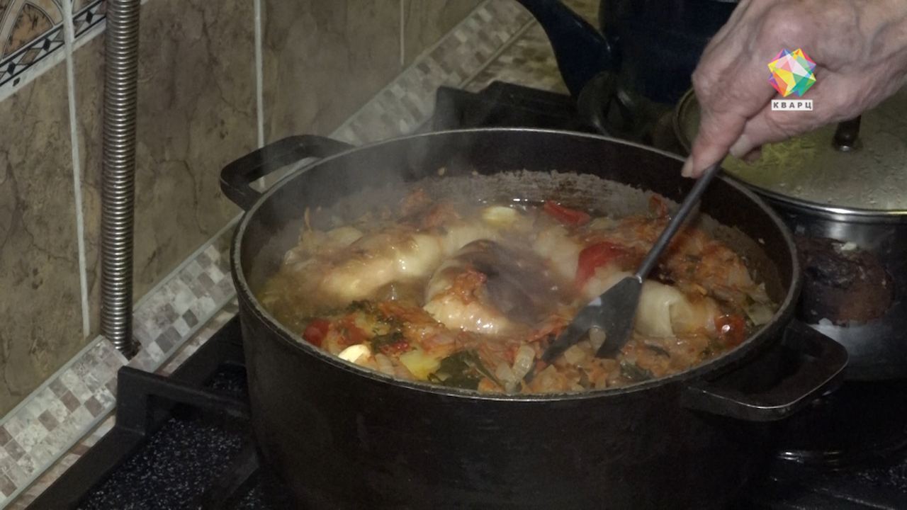 В свою очередь, Людмила Михайловна приглашает гостей за праздничный стол. Вячеслав Фетисов пробует коронное блюдо хозяйки - голубцы.