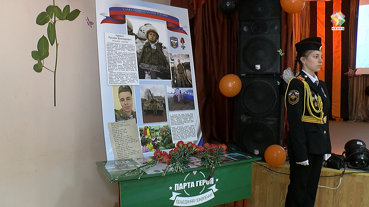 Родные первыми возлагают цветы к Парте героя. Руслан из многодетной семьи. На стенде кадры из его армейской жизни. Молодой парень после срочной службы заключил контракт, после - выполнял свой воинский долг в зоне СВО.