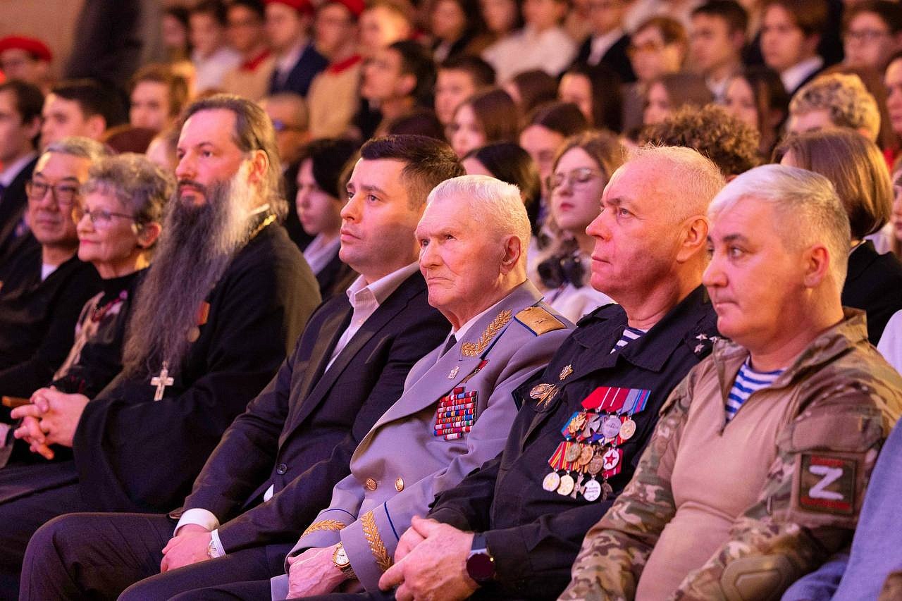 Стоя зал приветствует почетных гостей, среди которых сегодня Герой Советского Союза, командир легендарной группы «Альфа» Геннадий Николаевич Зайцев. Урок мужества в концертном зале администрации посвящен настоящим патриотам страны, которые в разные годы совершали подвиги во имя интересов своей Родины.