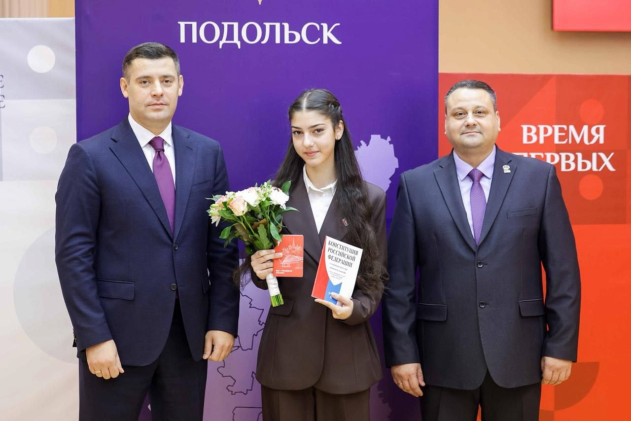 Глава Подольска проводит торжественную церемонию «Я – гражданин России» вместе с председателем Совета депутатов Игорем Науменковым. В зале лишь те юноши и девушки, которые хорошо учатся, занимаются спортом и творчеством, при этом ведут активный образ жизни.