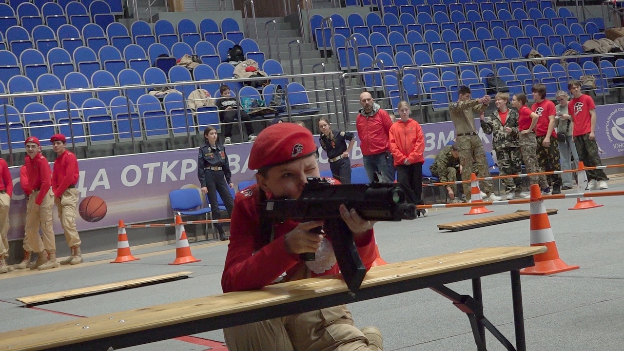 Изо всех сил старается юнармейская команда школы №18 имени Подольских курсантов. Дмитрий Федосов с автоматом Калашникова на ты. На тренировке собирает за 27 секунд и здесь старается не подвести.