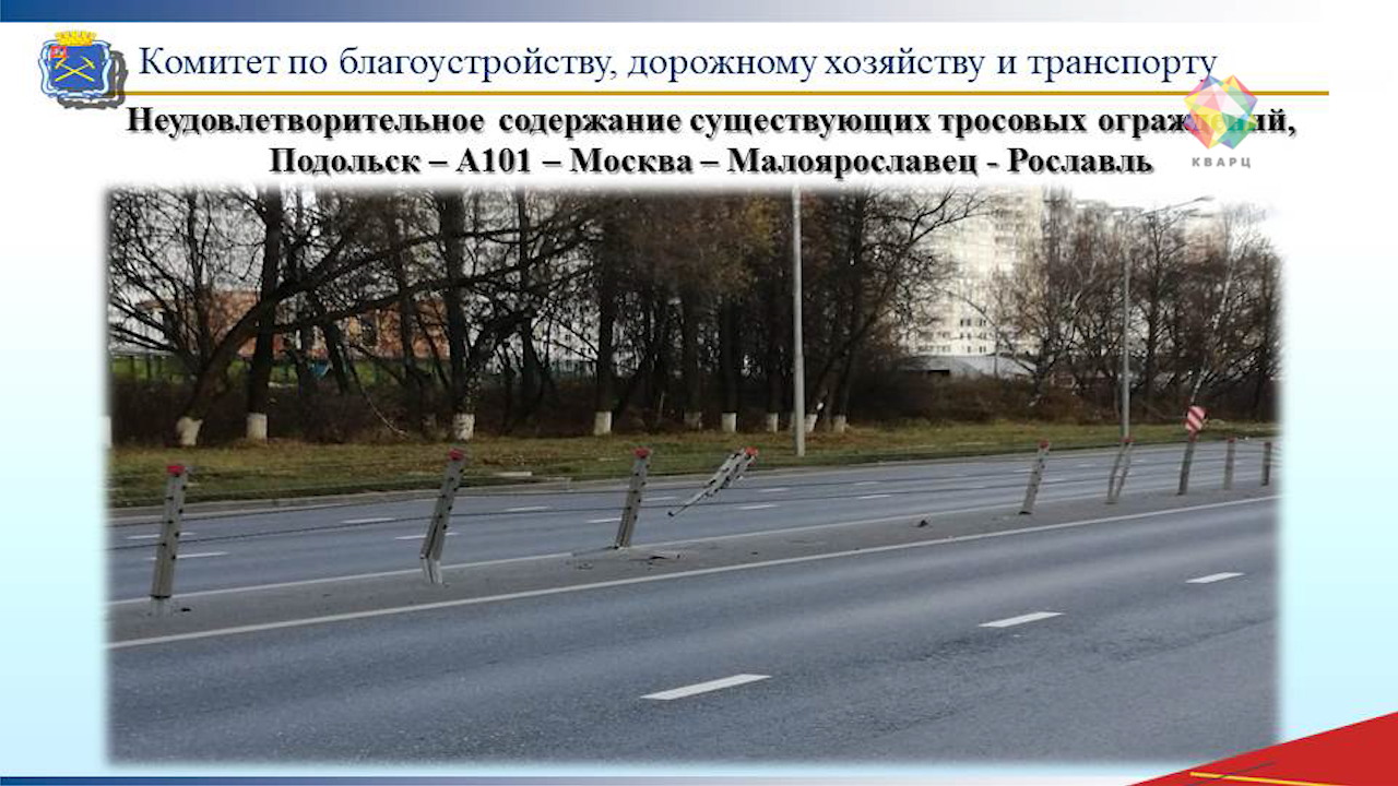 - Моя просьба к вам - довести информацию о том, что давний вопрос по многочисленным обращениям жителей рассмотрен сегодня с участием городского прокурора и начальника УВД. Поставлены вопросы о нарушении ГОСТов при установке ограждения, о неудовлетворительном содержании ранее установленного тросового ограждения, поставлены вопросы о надлежащем его содержании в осенне-зимний период, - говорит Николай Пестов, Глава Подольска.